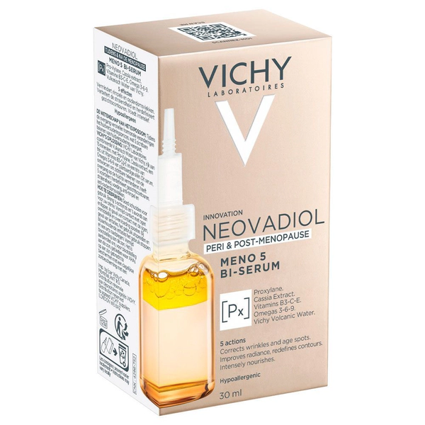 Vichy Neovadiol Meno 5 Bi-Sérum es un sérum facial antiedad con una innovadora fórmula bifásica, diseñado específicamente para compensar los cambios hormonales de la peri y postmenopausia. Gracias a su combinación de bases oleosa y acuosa, este concentrado actúa sobre los cinco signos críticos de la edad: redefine el contorno, corrige manchas, reduce arrugas, aporta luminosidad y recupera los lípidos esenciales de la epidermis.